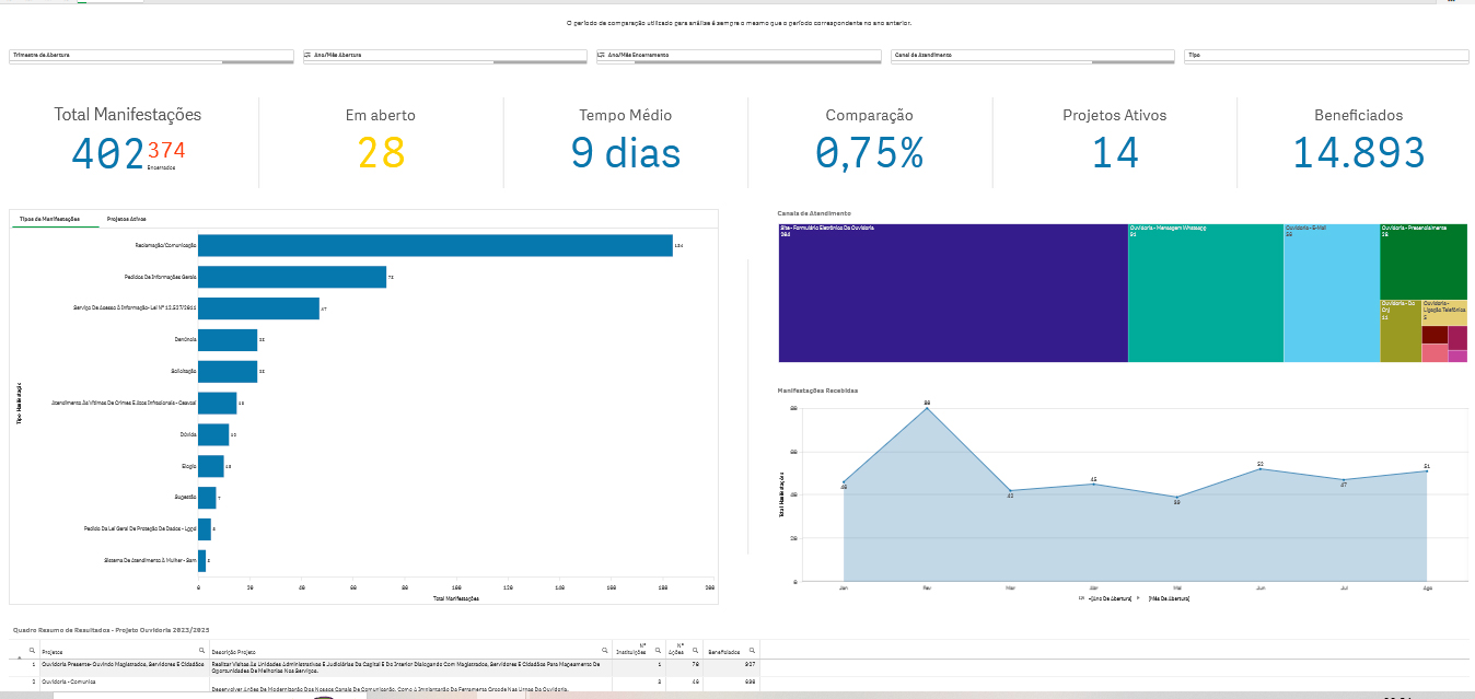 Nesse painel é possível visualizar os números de manifestações recebidas pelo Sistema Informatizado da Ouvidoria e também os atendimentos realizados por meio dos diversos Projetos da Ouvidoria para o Biênio 2023/2025.